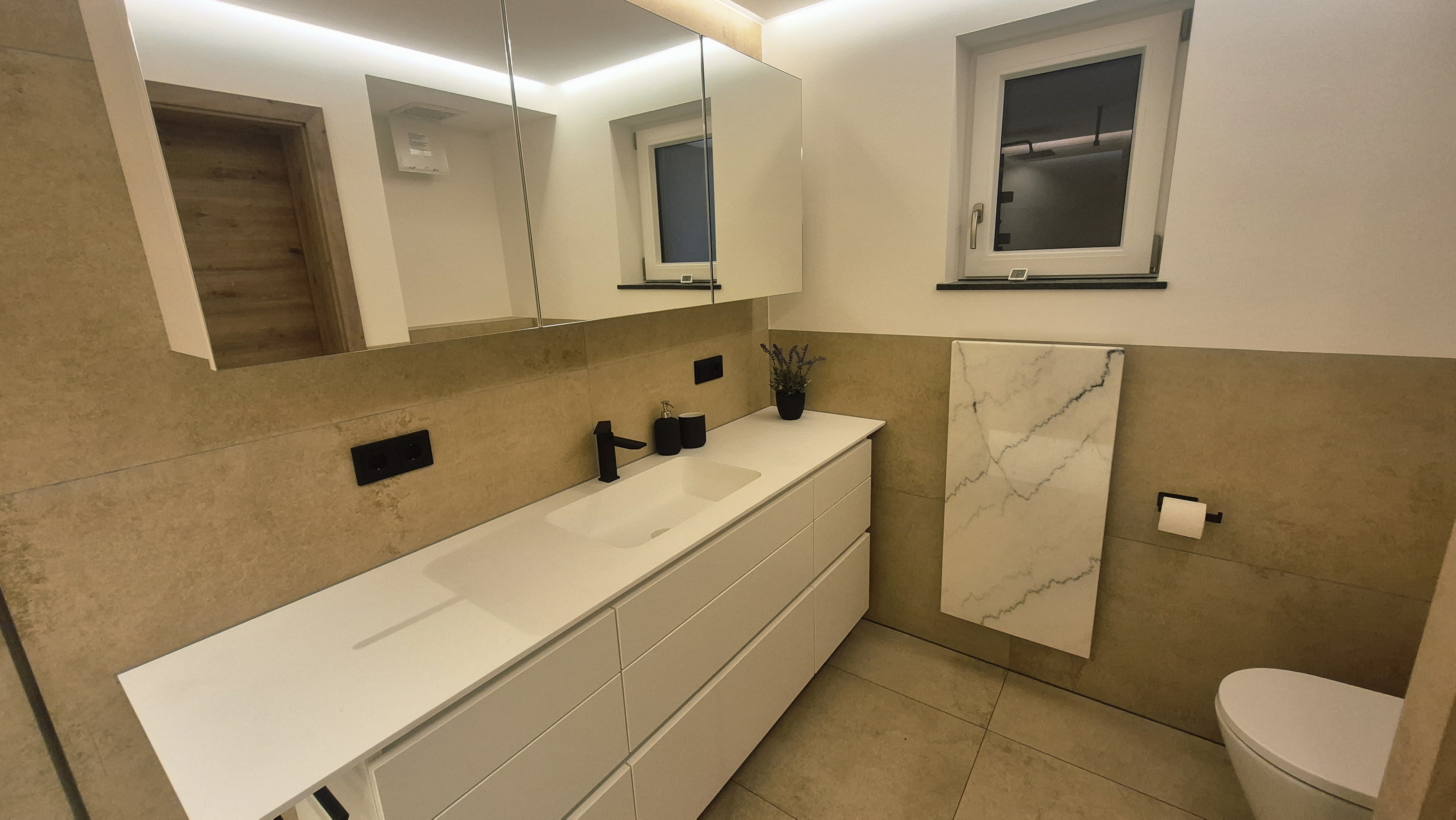 Kochfeld, Backofen, großer Kühlschrank, Gefrierschrank, Spülmaschine, Toaster, Kaffeemaschine, Wasser- und Espressokocher - Bad: